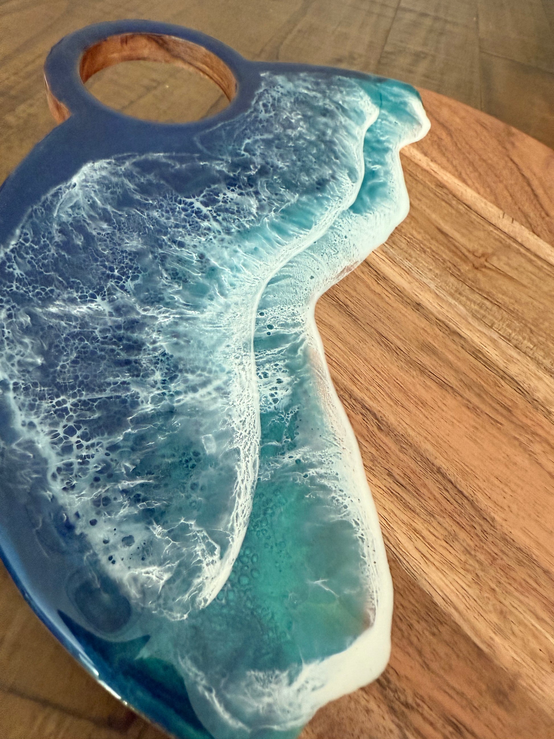 Elevate your entertaining with this striking circular charcuterie board, where artistry meets function. Measuring 11.75 inches across, it features a stunning resin design that captures the dynamic movement of beach waves, bringing coastal elegance to your table. Perfect for hosting gatherings, this piece doubles as a conversation-starting decorative accent.